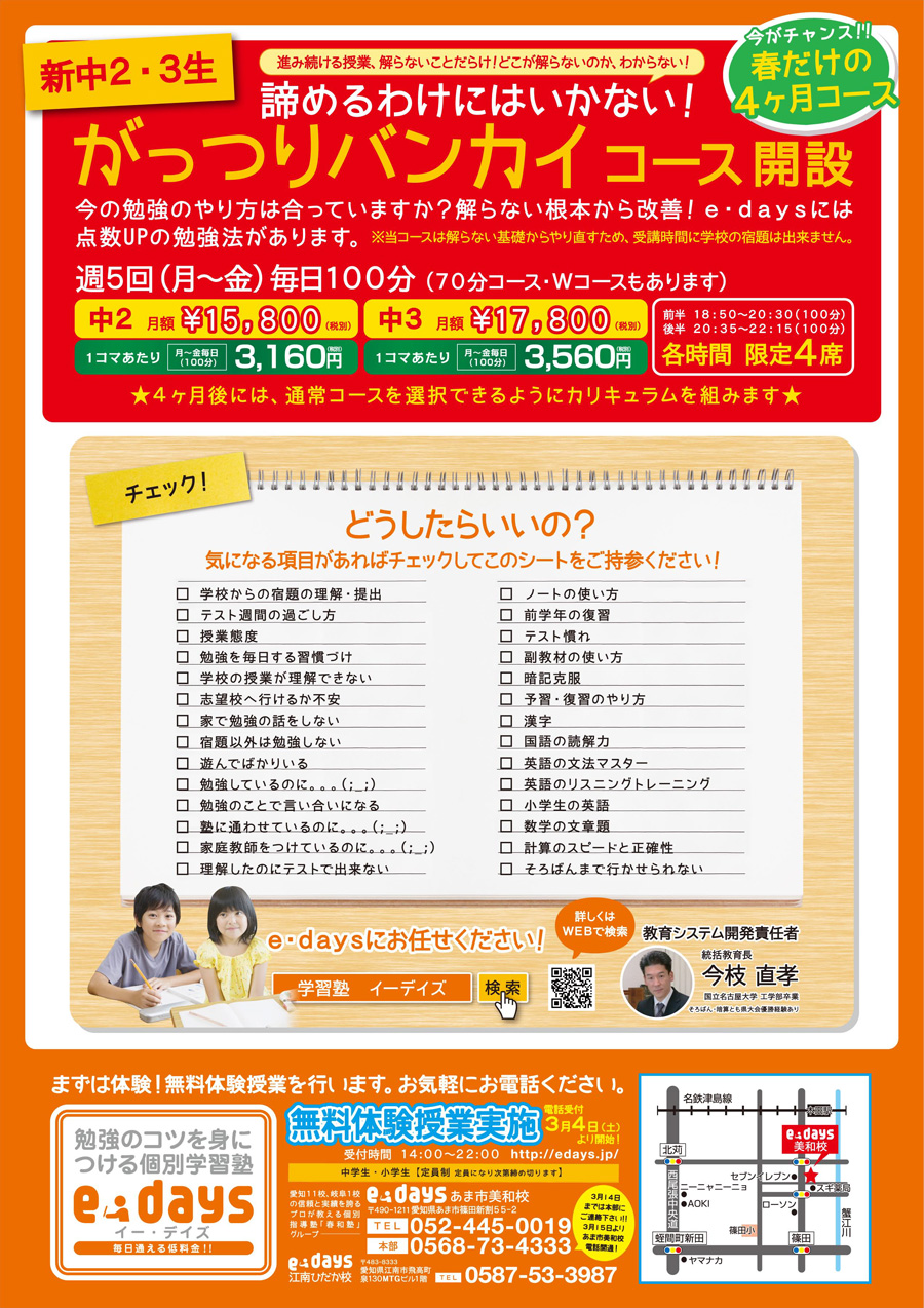 春期講習&春の入塾生募集中。今ならチラシ持参の方限定1週間分無料!